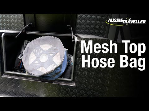 The Aussie Traveller Mesh Top Hose Bag is designed to store water hoses and keep them tidy and tangle free while on the move. The robust mesh lid allows air flow for drying of residue water, whilst the heavy duty Ripstop canvas ensures your hose stays protected.