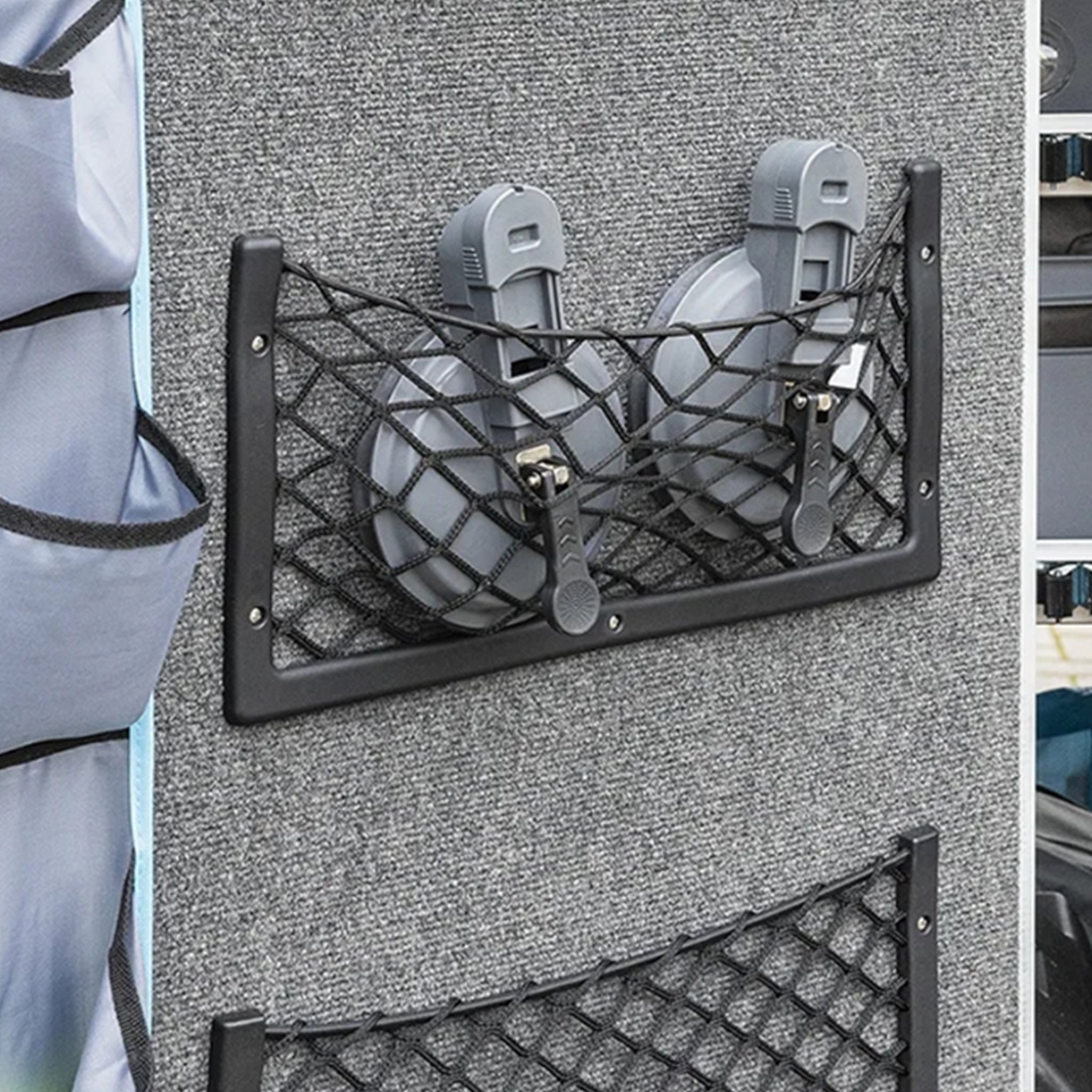 - Elastic netting stretches to fit and keep items secure