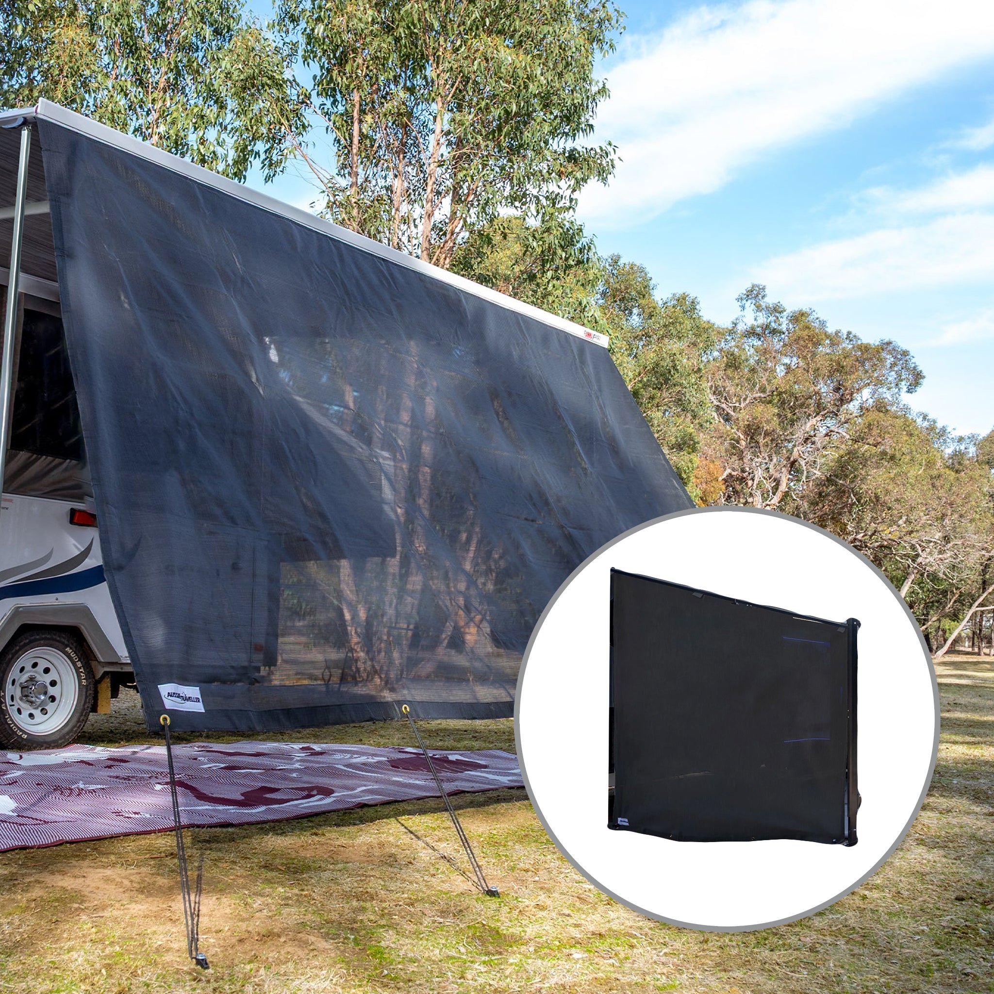 The Aussie Traveller Black Sunblocker Long Side Wall will protect you and your family from the harsh Aussie sun. This ventilated partition is perfect for busy campgrounds providing a barrier between you and your neighbours, while keeping your campsite cool and protected.