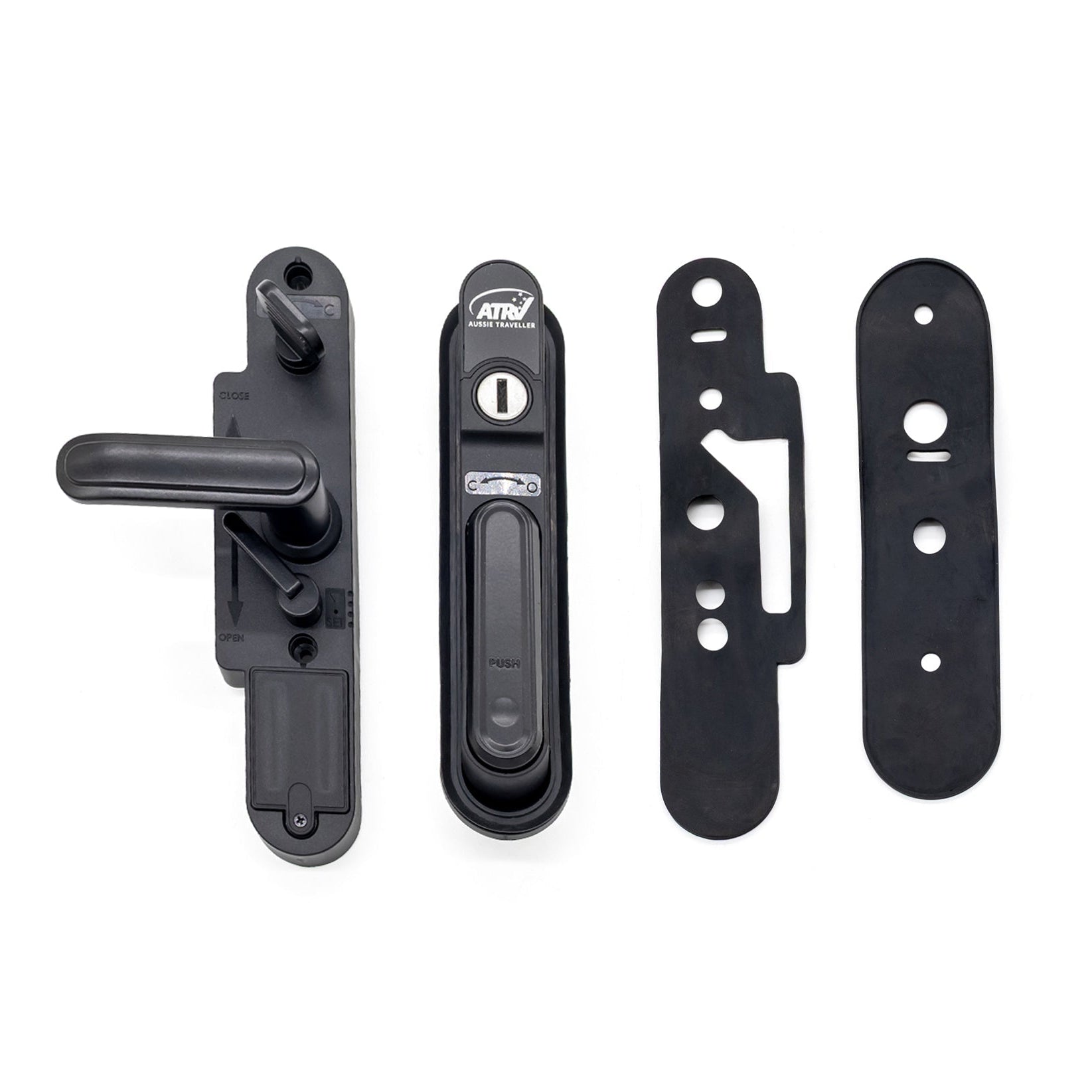 Door handle assembly kit suitable for Aussie Traveller DCE Doors with hinge on right-hand side only. Does not include barrel & key sold separately.