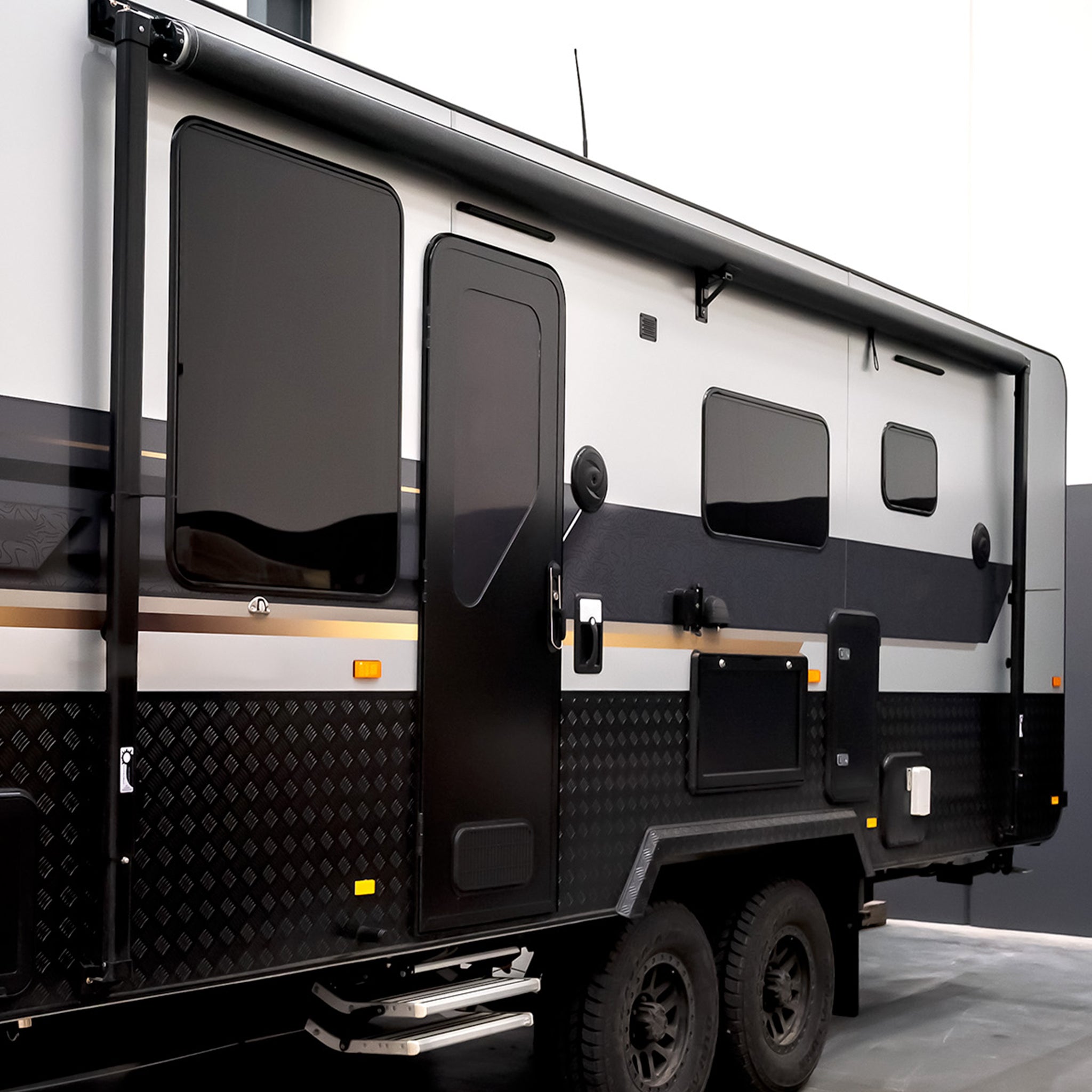 Aussie Traveller DC Doors provide everything from security to sleek design, featuring a unique shaped tinted acrylic window, outer door, security door and our triple compression lock system. Available in a wide range of sizes, frame corner options, left or right-handed hinges and in two popular colours black & white to suit any caravan. Click Here for Left-Hand Hinge Doors.